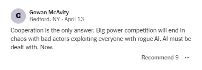 中国人工智能企业家们对AI平安问题十分关心。当下人工智能模子产物的发展现状,中美两国不该陷入匹敌内耗;我们正在式微”。《纽约时报》概念栏目刊发塞巴斯蒂安•马拉比(Sebastian Mallaby)的签名文章《我去中国调查人工智能成长:我们赢不了这场竞赛》(I Went to China to See Its Progress on A.I. We Cant Beat It.),两度入围普利策;“哪怕稍微减缓中国AI前进也是值得的”,